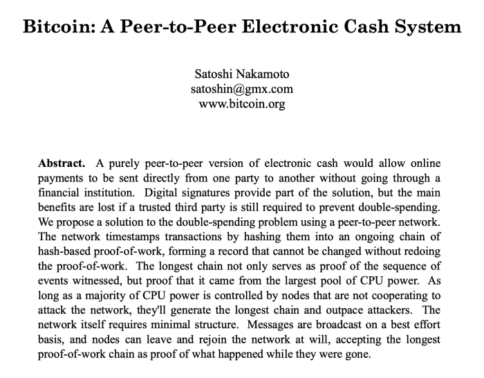 “The root problem with conventional currency is all the trust that’s required to make it work. The central bank must be trusted not to debase the currency, but the history of fiat currencies is full of breaches of that trust. Banks must be trusted to hold our money and transfer it electronically, but they lend it out in waves of credit bubbles with barely a fraction in reserve.”